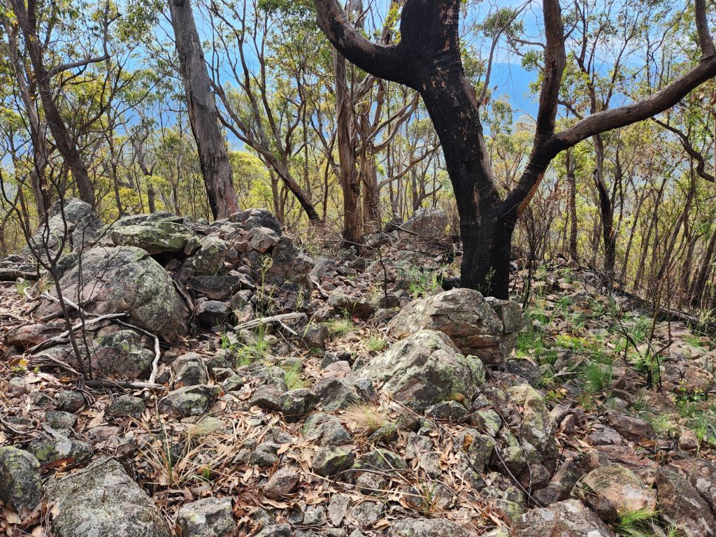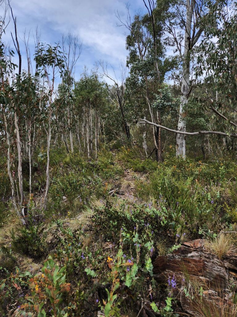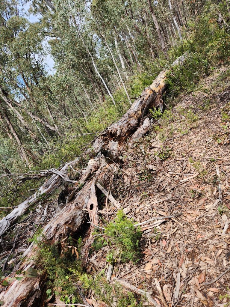 The climb to Johnnie’s Top took just over three hours, with varying levels of steepness along the way. The group who cleared the track at the start of this year did an amazing job, and there was only one short section where I lost the track and had to improvise. That must have been such hard work, carting chainsaws around up there, and I’m so grateful. Early in the climb, I looked down and saw Jubble making his way back through the flats, and we were able to call out messages to each other. How sweet.