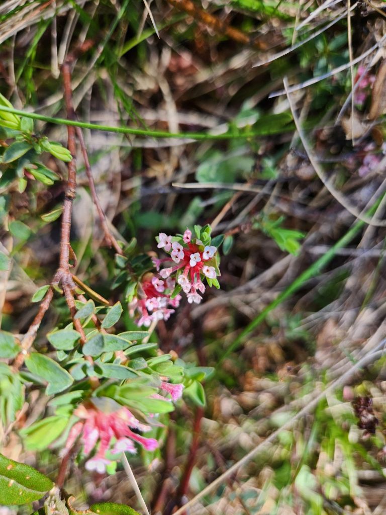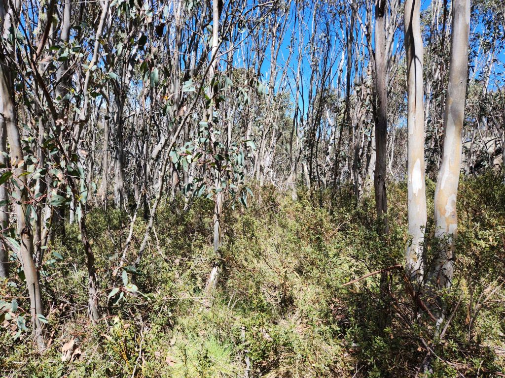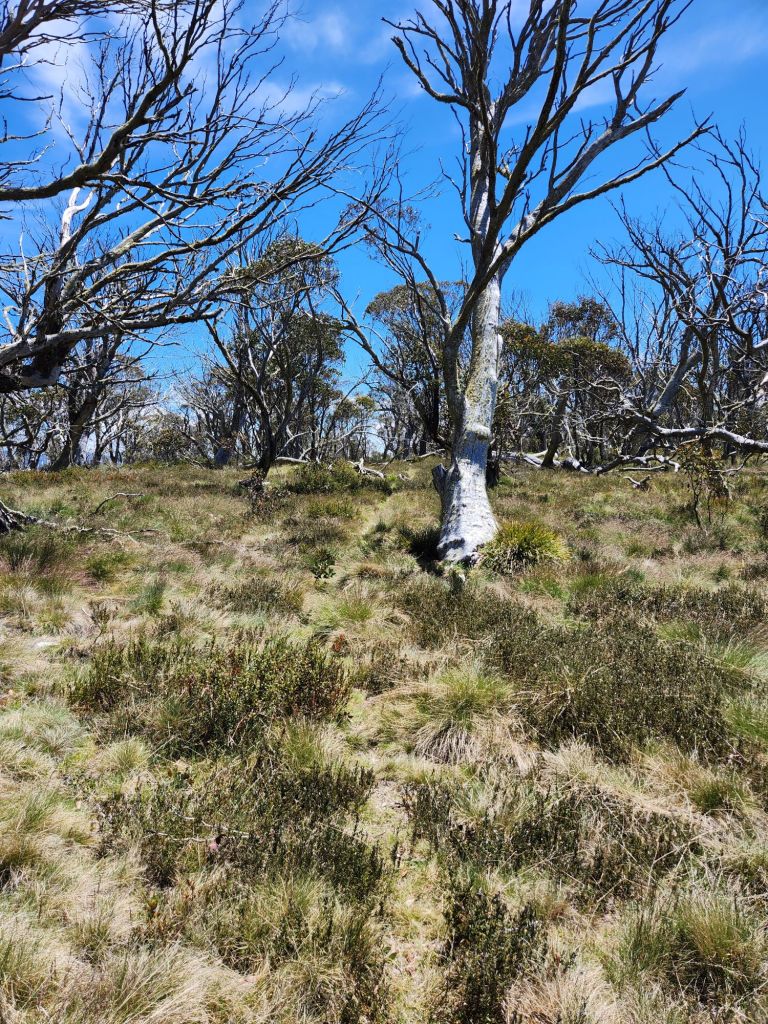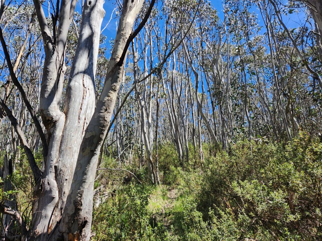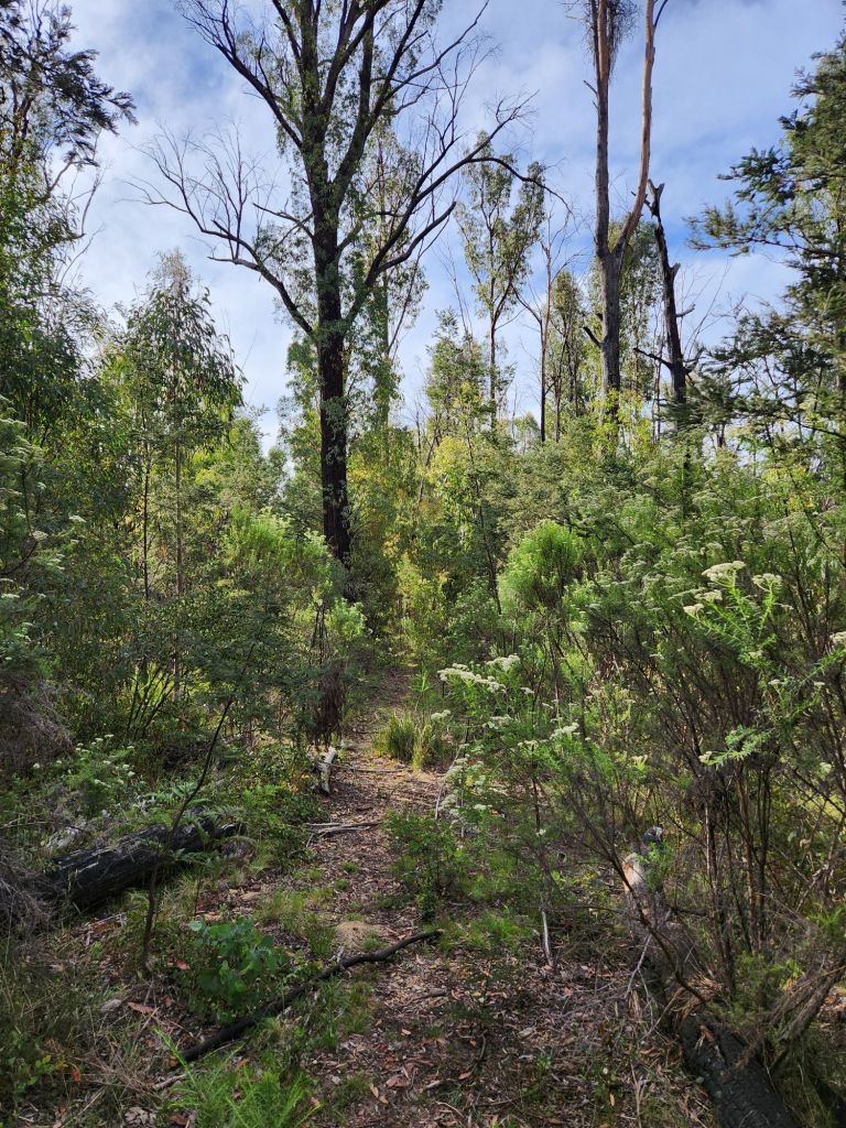 The track started out gently climbing on a vehicle track. I was on the lookout for snakes after Scott, Jake, and Seb had just seen a tiger and a copperhead on their climb up to Omeo Highway. in the big grassy sections, I was totally sure there were snakes hiding in every tussock! It was pretty steep and pretty easy to lose the track. It’s much easier to keep your eyes on a faint footpad heading downhill than up in my experience. There were a ton of fallen trees and lots of bushes growing over the path, so even if you could see the path, you had to push your legs through the plants to walk on it. It was slow going.