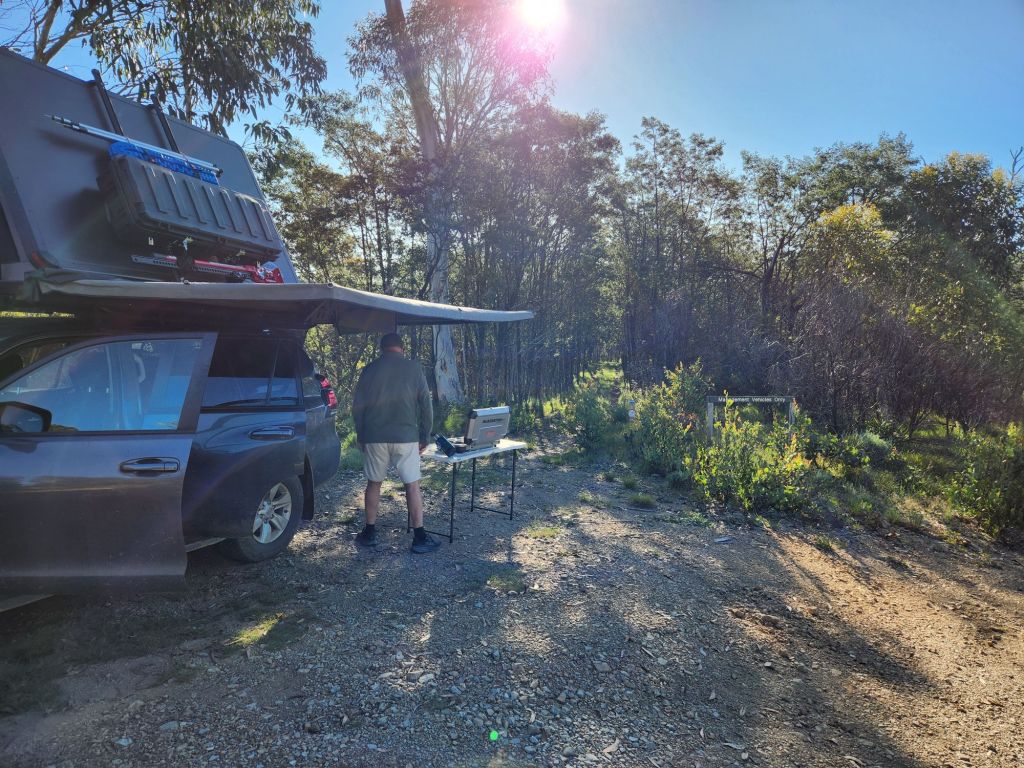 I got to our meeting point at East Riley Road at 12:30, almost two hours before Jubble. I met a couple of guys who were grading the road. They were so nice, asking if I was okay, did I need water, offered that I could sit in their car to wait for Paul if I wanted while they went off road grading. They also told me they were camping at Riley Hut not too far away and said we could also camp there. I had worked out that if Jubble could drive further on to Van Dammes Track, a 4WD track, and I walked to there, that would cut 6km from tomorrow’s walk, reducing it to 19km. That appealed to me because I’ve been warned how tough going the track gets from this point on. The 4WD track was graded medium, so we didn’t know if we’d be able to drive it if not. Lucky for me, we could, and we decided I would walk back from there to the original meeting point, and Jubbie would drive back. While I was getting ready to leave, who should walk up but Jack! After a chat and a very handy app recommendation (Peak Finder lets you point your phone at mountains and it tells you which they are), we both headed off in different directions, Jack south bound to Barry’s Saddle and me north bound back to East Riley Road. That 6km really was a bit of a slog. While the track was easy to follow, it was overgrown, and I had to constantly push head height, overhanging branches out of my face. There were also several uphills thrown into the mix. I saw a big black snake. In fact, my foot came very close to it. Luckily, it was close to its tail, and it moved away from me quickly. I arrived back at East Riley Road to find Jubbie having a snooze in the rooftop tent – apparently, it needed to be dried again, from the inside!