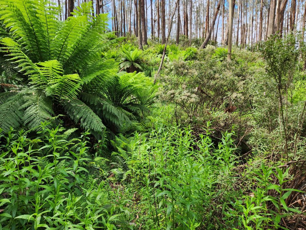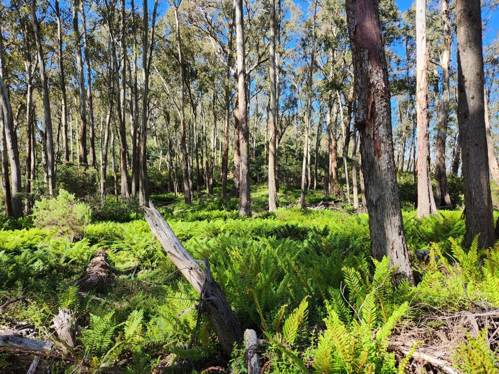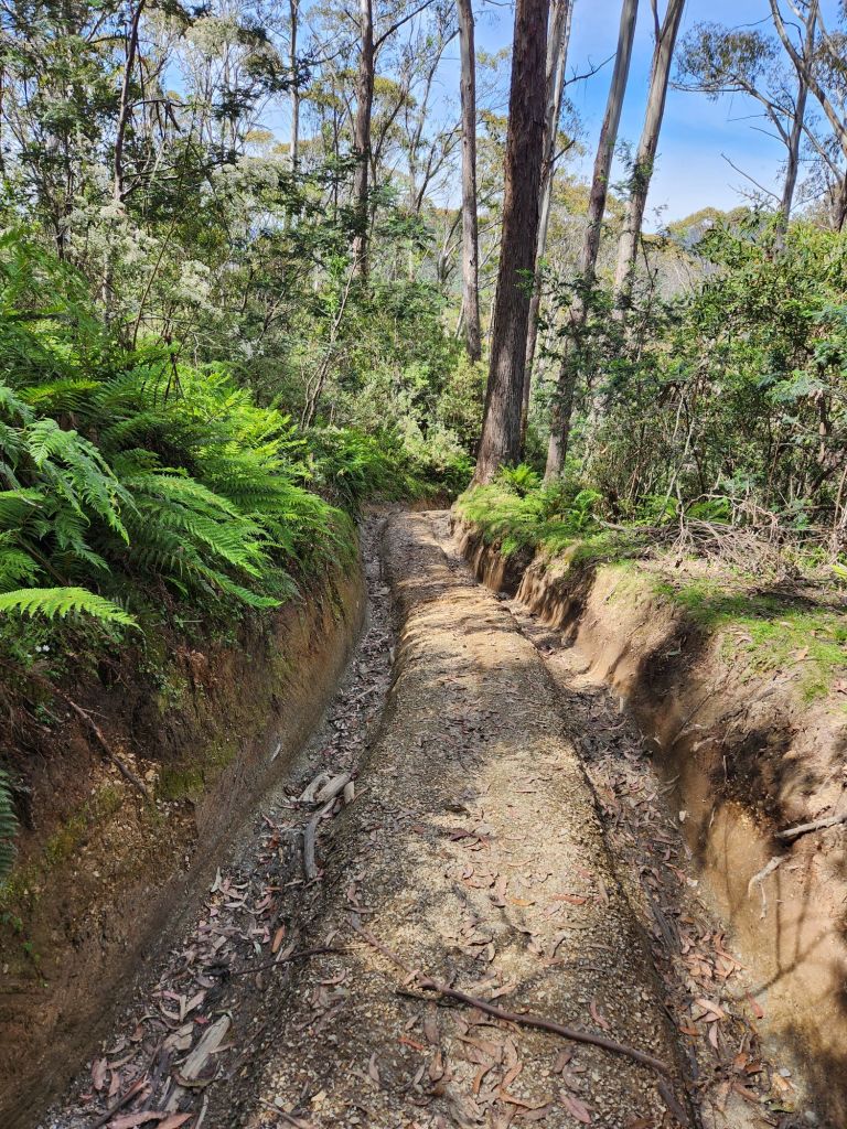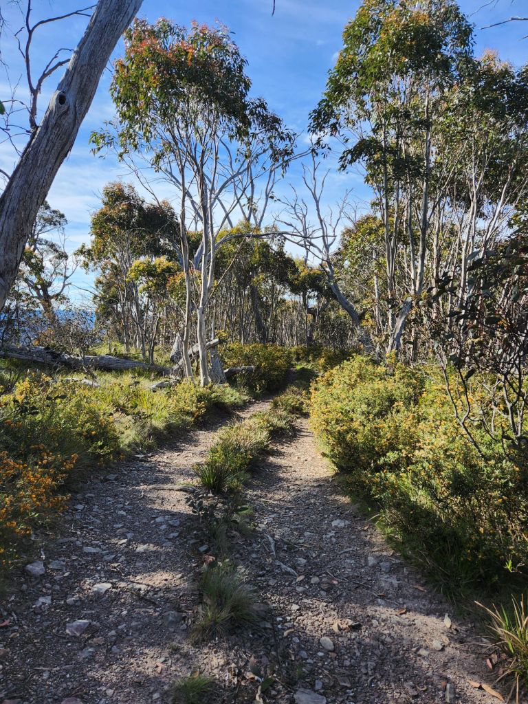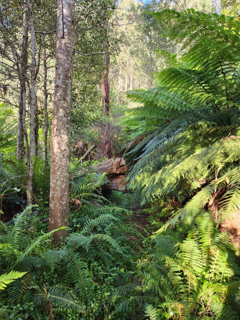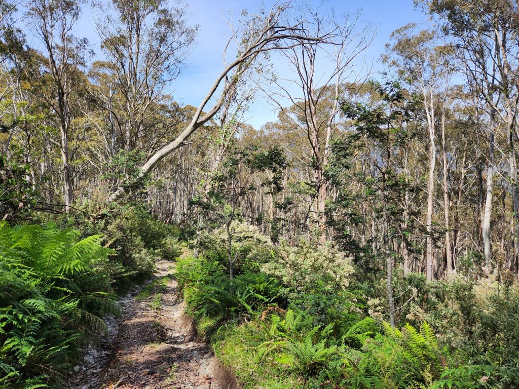 As the trail started to head down hill and the vegetation changed, the dead trees stopped, and there were all these lovely tree ferns. That’s where I came across black snake number two for the day. It was stretched right in the middle of my path, having a lovely sun bake. I stomped my hiking pole onto the ground, and it didn’t move. I then moved a stick near it, and it raised its head. I moved the stick again, and it quickly and quietly slithered away. That was all fine, except the next section of trail down to the road was covered in dense ferns, and I couldn’t always see where I was stepping. I just kept hoping it wasn’t onto the next snake. It was really beautiful though and a lovely change from the rest of the day.