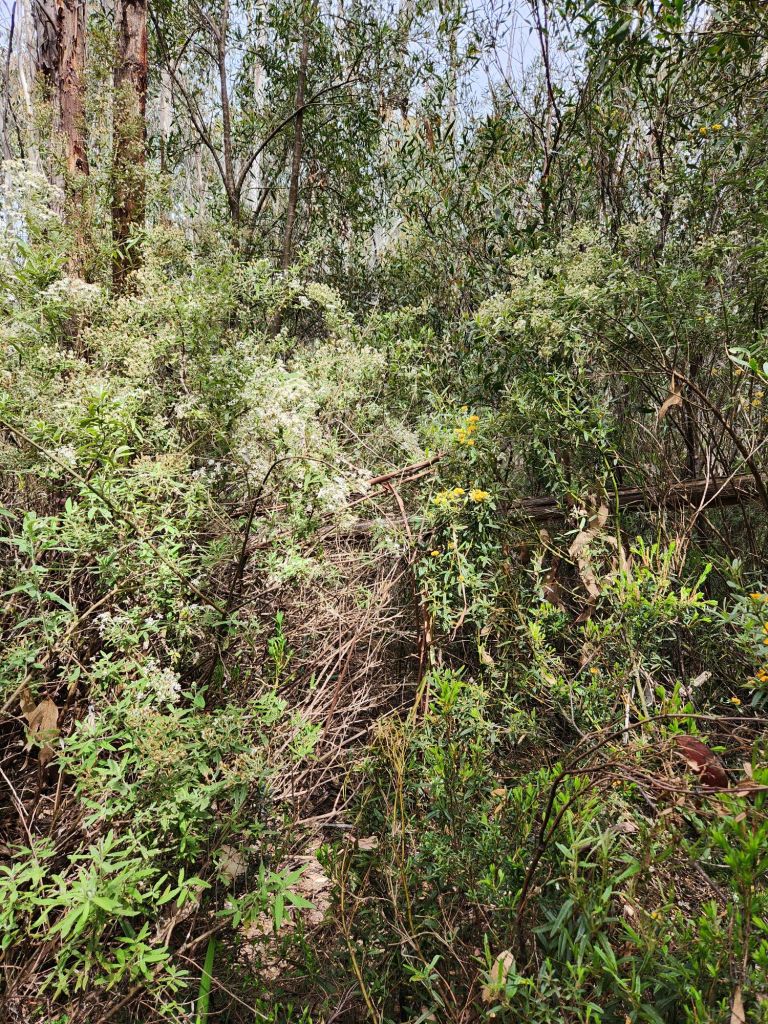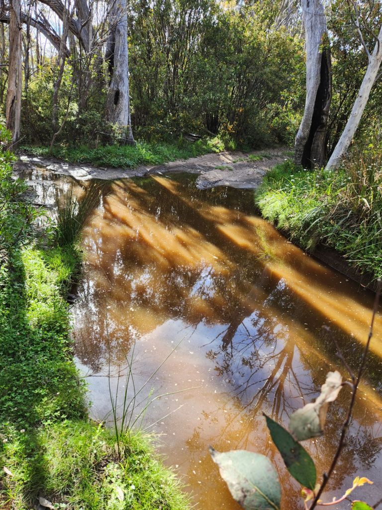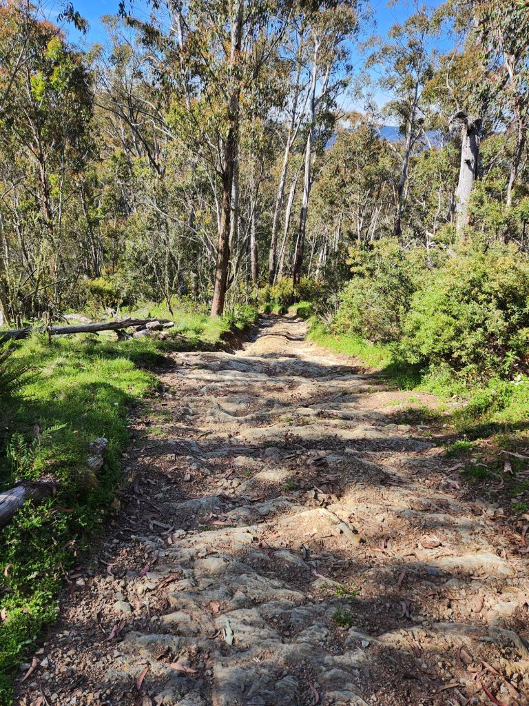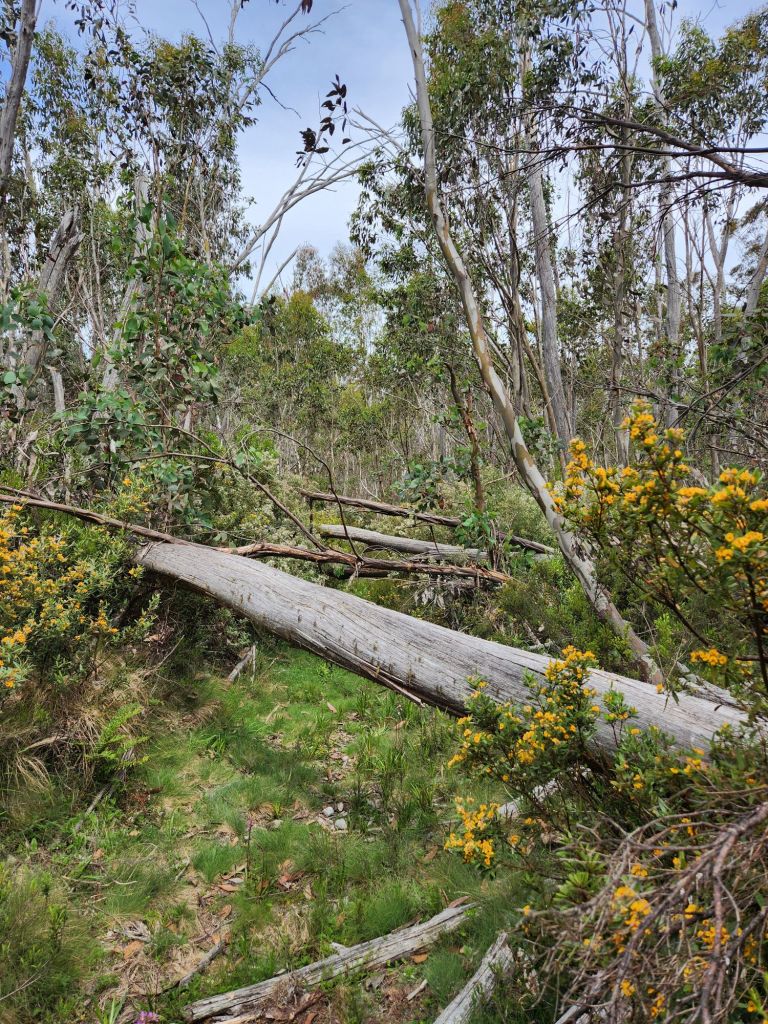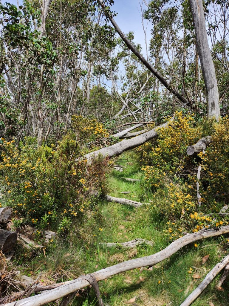 After Rumppf’s Saddle came Barkly River Jeep Track, a super steep, very rough 4WD track. Unfortunately for me, it was uphill, very uphill! But all things come to an end, and at the end was Jamieson Licola Road, a wide, well graded dirt road with some great views across to distant mountains. After a few km of that kind of walking, the trail headed onto a bush path, which clearly used to be a vehicle track, but is now for walking only. It started off being quite nice, a welcome change from road walking. But soon, I encountered some fallen trees across the path, then more, then more. There was 1.5km of track with trees fallen everywhere like a game of pick-up sticks. Some I could step over, some I had to climb over, some I had to crawl under. So not enjoyable at all. There were also a couple of spots of very dense regrowth bush where I had to full blown bash my way through. Slow and boring and hard work.