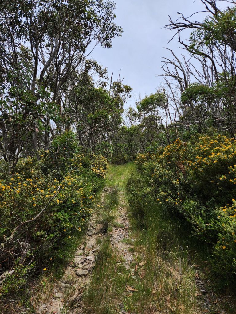 Most of the rest of the day from the summit of Mt Sunday was along 4WD tracks, easy to walk but kind of boring. Some parts were super steep and rutty, others flat and easy. There were annoying puddles of very dirty water along the track, which meant that at times, I had to go off track into the bushes to avoid them. Just enough times to be really irritating. Parks Victoria recommended not to drive that track, and I could see why – super rutty and rocky and steep. I had lunch on a grassy patch looking across to Mt Skene.