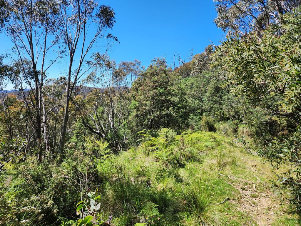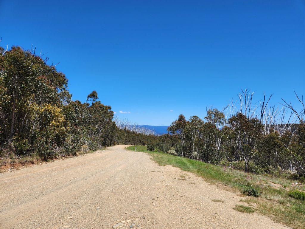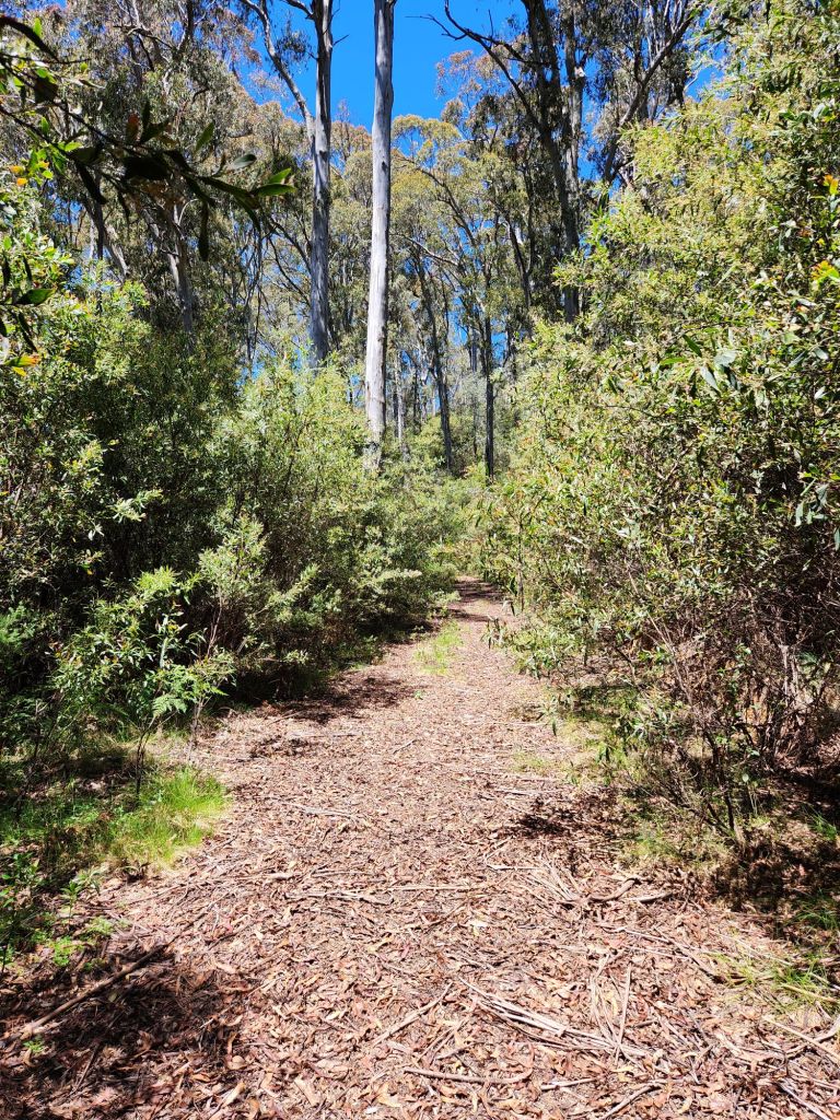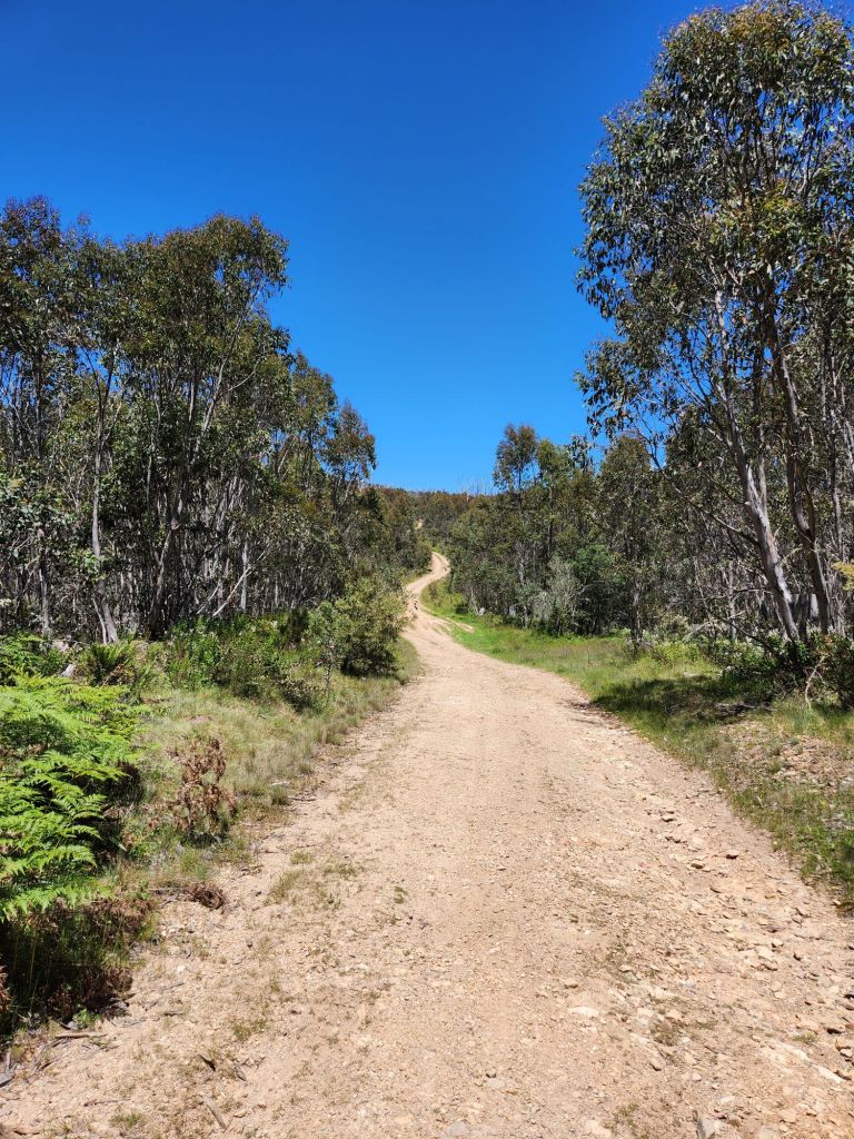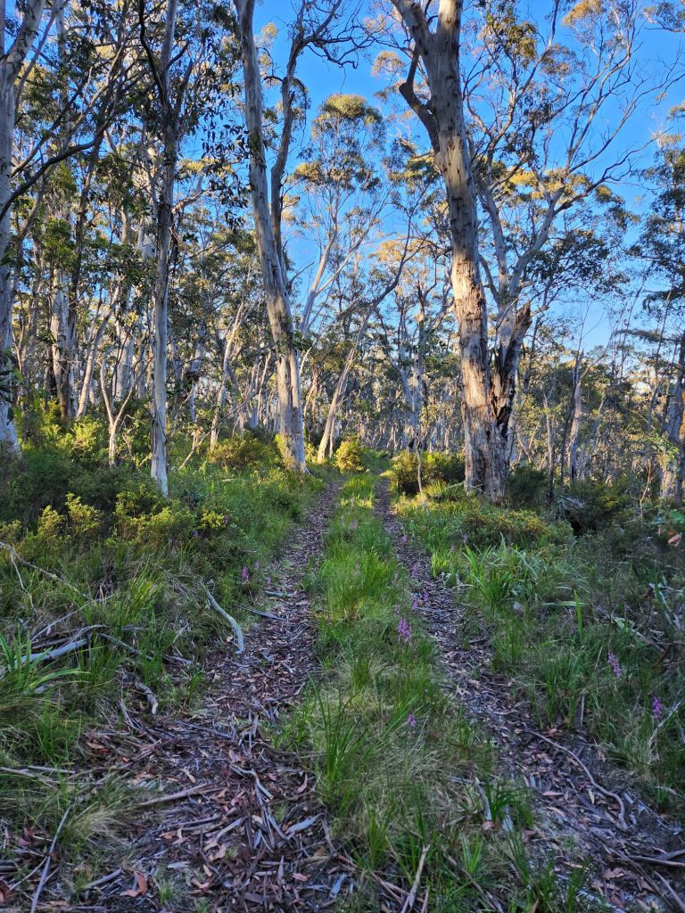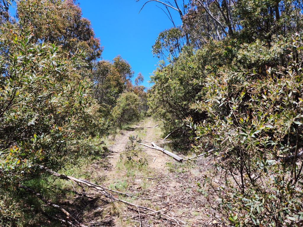 After the down comes the up, and this one was a slog up Champion Spur Track. I think it’s called that because you are a champion if you walk up it! It was about 2.5km of very steep 4WD track and not enjoyable under the sun. My memory from last time was that at the top of the steep section of that track was Mt Selma Road. But in fact, Champion Spur Track goes for a lot longer than that, and it kind of did my head in that it was so different from my memory. I also made a new memory by taking a different track (I think it was Stander Creek Track). I had mistakenly mapped that track instead of mapping to stay on Champion Spur Track, and initially, I thought it was pretty nice. It was an overgrown vehicle track cut into the mountain, winding its way around the terrain. So nice, I decided to eat my peanut butter wrap while walking. As soon as I got it out of my backpack, the trail became massively overgrown, and I had to use both hands to push foliage and blackberry out of my way whilst protecting my wrap! I was about a quarter of the way in and realised this wasn’t the official track, but decided to push on anyway rather than going back. I probably would have been better off going back – this track was a bit longer and definitely bush bashier, but it was fine and eventually it joined back up with Champion Spur Track.