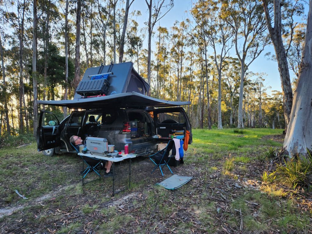 The next few hours, I spent dirt road walking. It wasn’t unpleasant and was a pretty easy way of getting through some km. All I could hear were birds, insects, my feet, and my backpack. And all of a sudden, I was at Mt Victor, our meeting point for the day. We camped at a very convenient grassy spot right at Mt Victor. The moon is full, or close to it, meaning we’ve been out her for a month already! Feels like ages ago we saw those two male kangaroos fighting under the full.moon at Magpie Flat Camping ground.