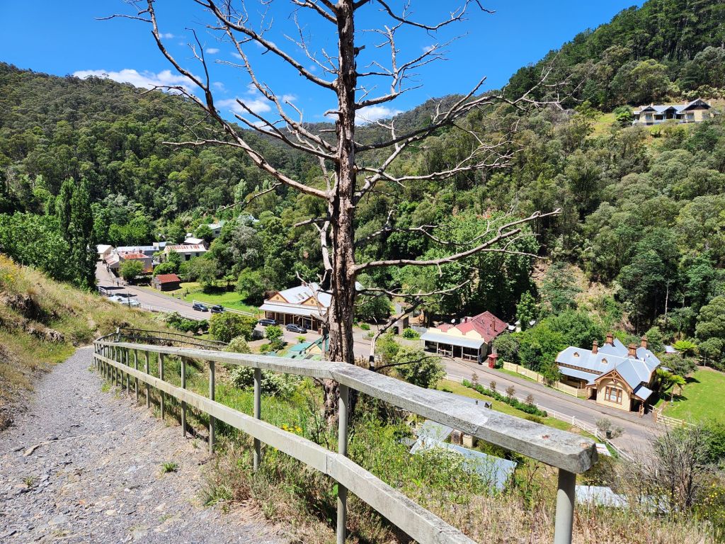 The very last section of the walk followed the path of an old tramway next to the Thomson River, which was really lovely both because it was in a very picturesque valley and also because it was flat! The Poverty Point bridge was closed due to structural issues, so we walked to the car bridge and crossed there. The downside to that was that we walked downhill to the car bridge and then back uphill to the tramway. As Jack said, of course the AAWT has a challenge all the way to the end! As we were walking along the final section of tramway above Walhalla, we heard Jubble calling out – he could hear us from the pub down below where he was waiting with food for us! What an amazing sense of accomplishment finally arriving at Walhalla and how fantastic to be able to finish with Jack, who I’ve been walking with or camping with or leap frogging or messaging all the way since Tin Mine Huts just outside of Thredbo.