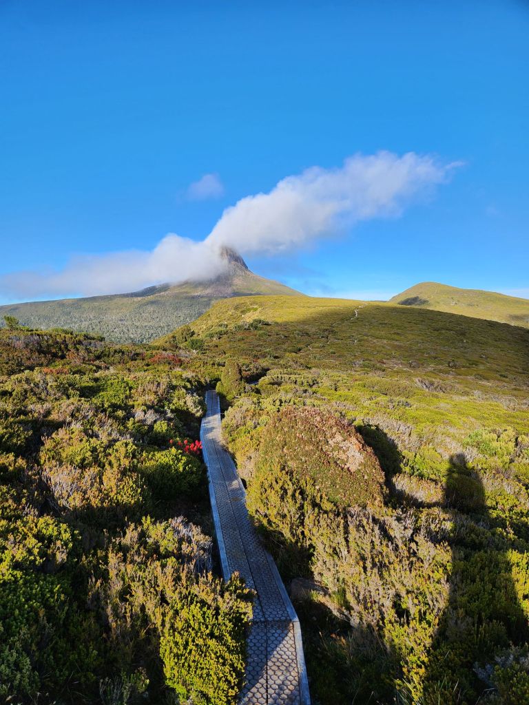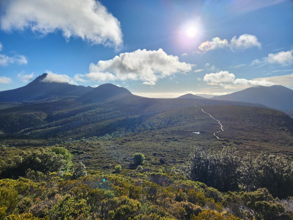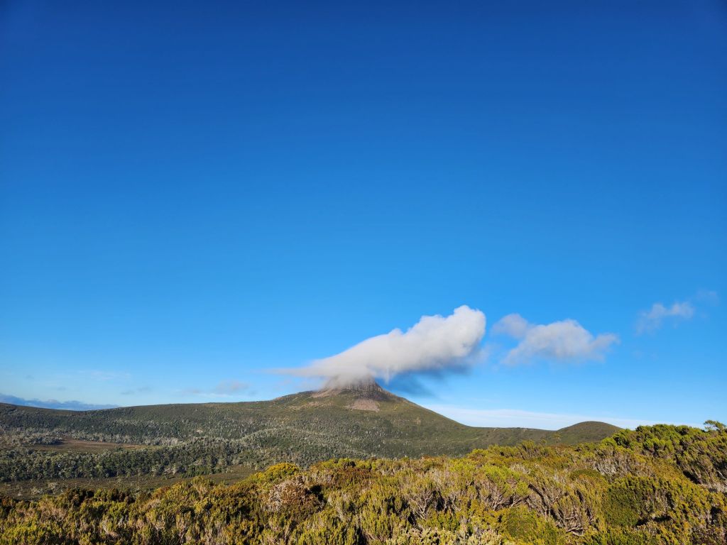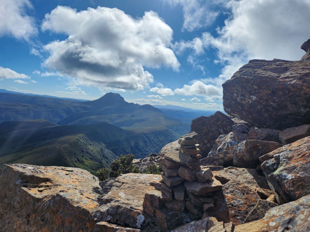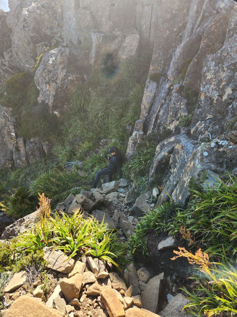 Kel and I headed off early to climb Barn Bluff, leaving Jubbie at the hut for a well deserved relax. I loved walking around Barn Bluff yesterday the same way I loved walking around Mt Jagungal on the AAWT. It was so stunning and a real treat to have been able to climb it with Kel. It was nowhere near as tricky as Cradle Mountain, and the trail was well marked with cairns and arrows. The view from the top was stunning, and we were spoilt to have it all to ourselves! We only saw two other people climbing up as we were heading down. We were also spoilt by the clear skies. While we were at the top, the clouds started coming over, but the rain kindly held off til we got back to the hut. When we got back to the hut, we found that Jubbie had managed to spot us on our way up and snapped a photo of us looking like little ants climbing the mountain!
