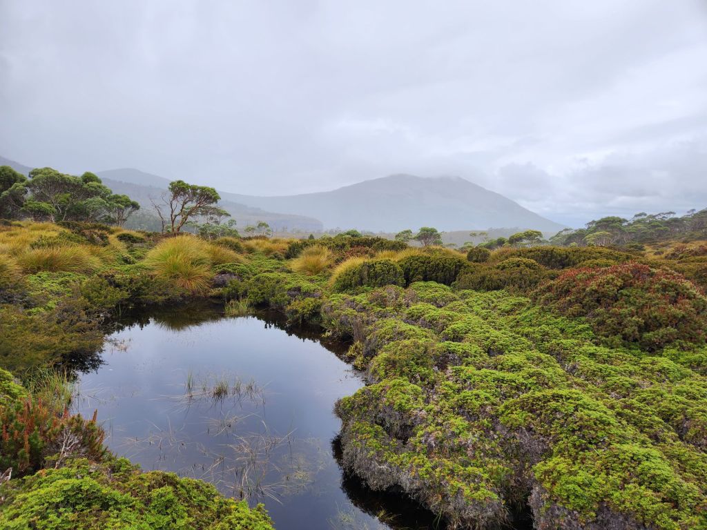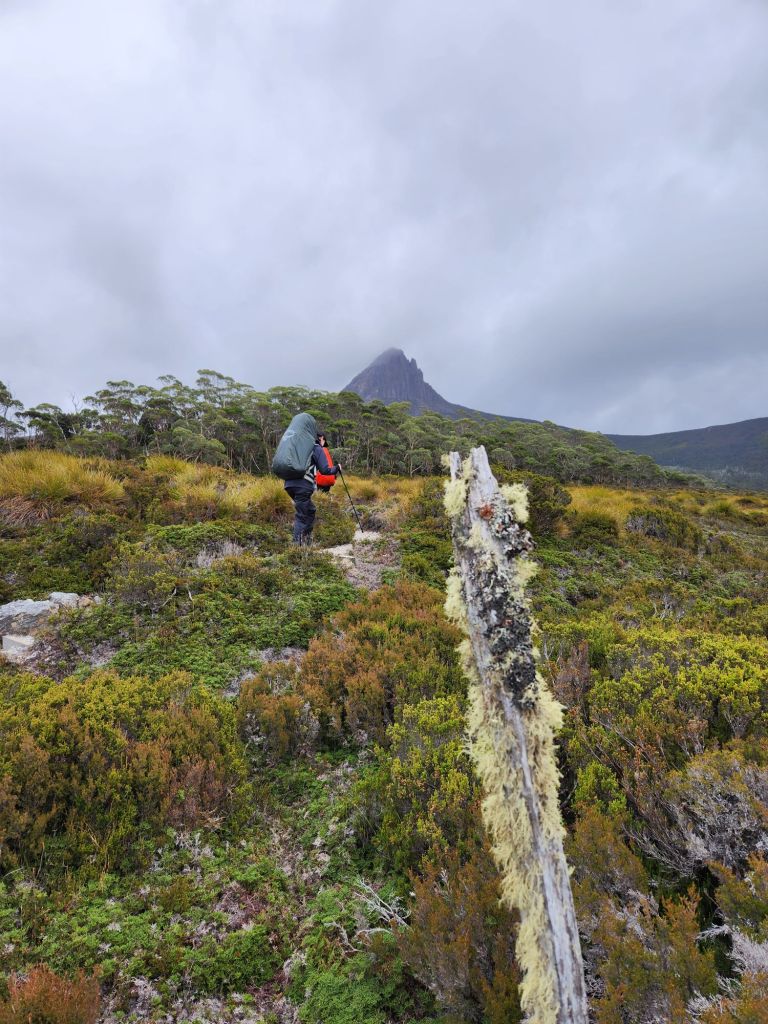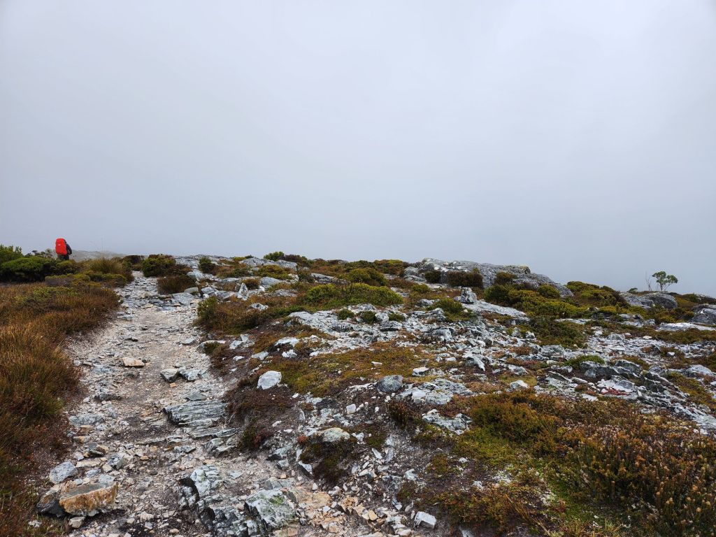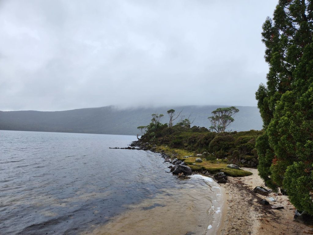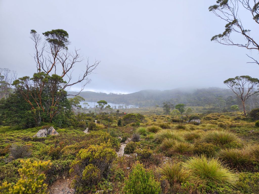 After a snack back at the hut, we headed off towards Windermere, all rugged up in our wet weather gear to protect against the rain, which was just starting. The mist and low clouds gave a completely different vibe to yesterday, which was really beautiful. We dropped our packs and took the side trip to Lake Will. It feels like you’re floating on air when you get rid of your pack! The lake was gorgeous, just a shame that by that stage, Barn Bluff was completely whited out because otherwise, it would have made a stunning backdrop.