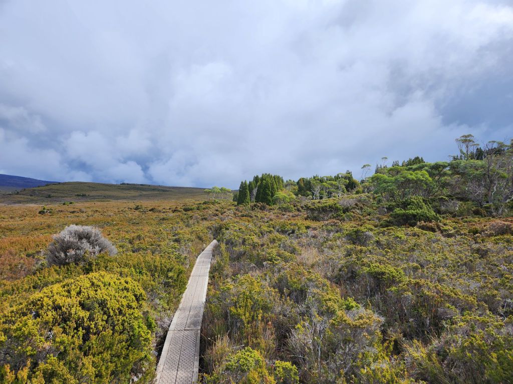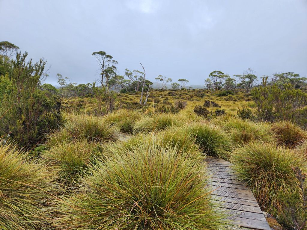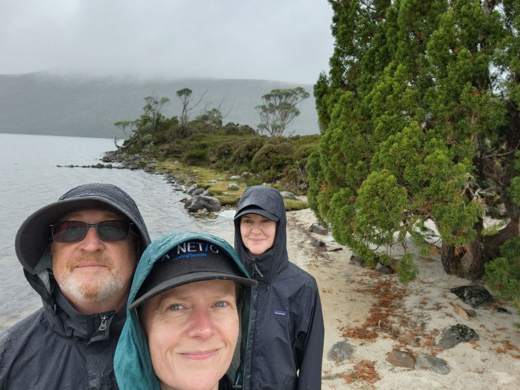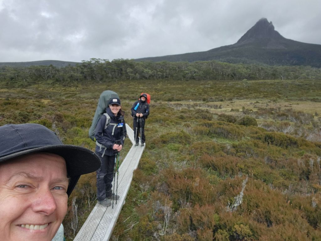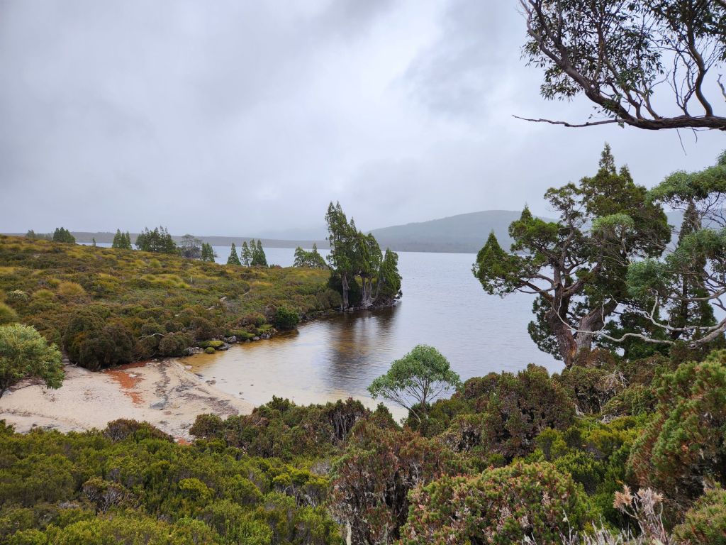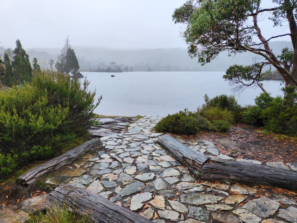 After a snack back at the hut, we headed off towards Windermere, all rugged up in our wet weather gear to protect against the rain, which was just starting. The mist and low clouds gave a completely different vibe to yesterday, which was really beautiful. We dropped our packs and took the side trip to Lake Will. It feels like you’re floating on air when you get rid of your pack! The lake was gorgeous, just a shame that by that stage, Barn Bluff was completely whited out because otherwise, it would have made a stunning backdrop.